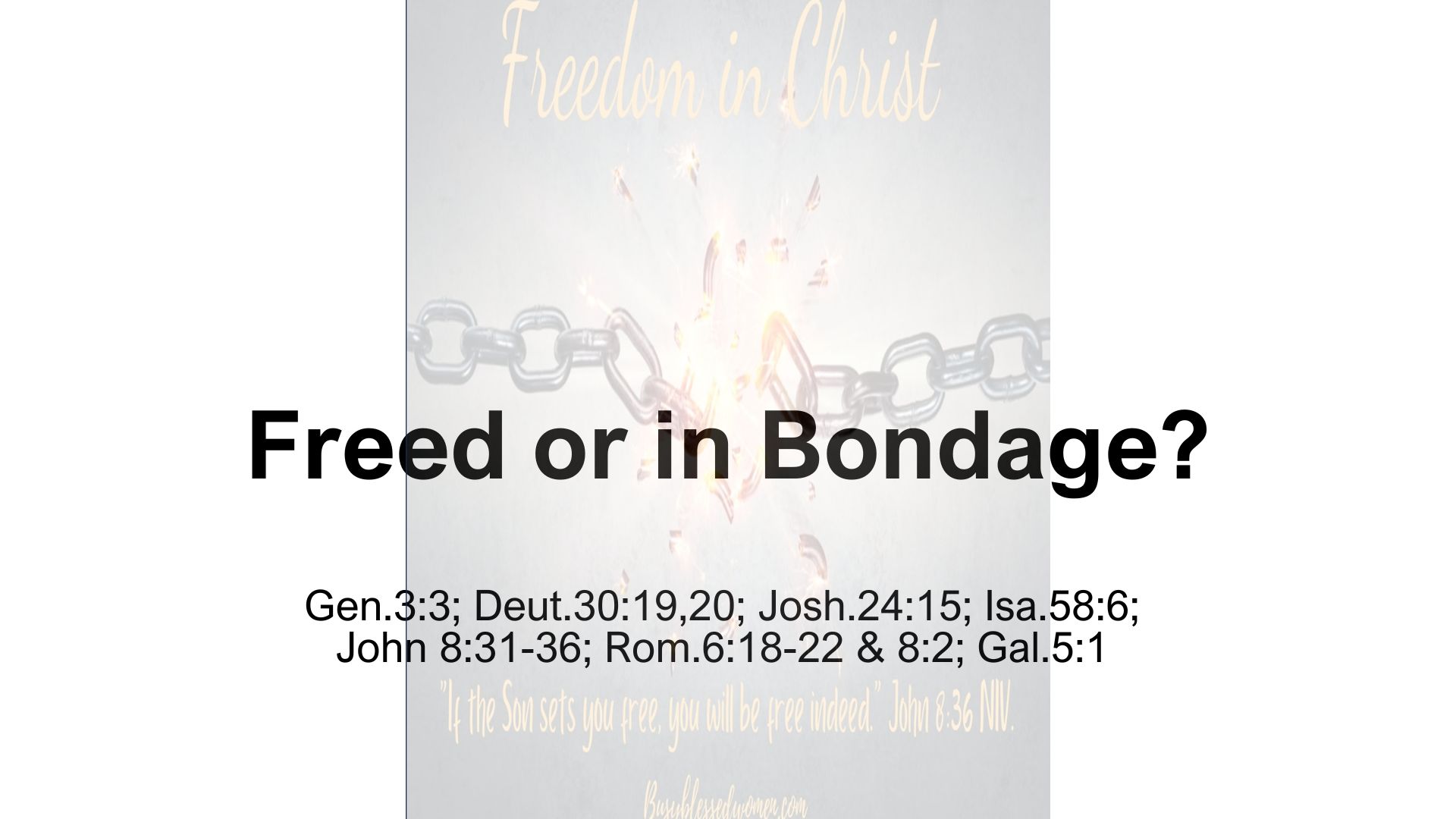 A growing our faith, A living sacrifice for Christ, A slave of righteousness or unrighteousness, Abiding in God's Vine, Avoid sins of the flesh, Cultivate Christlikeness, Dying to Self, Faith, Faith or Feelings, Give up, selfish wants, Great faith, no doubting, Inner freedom from sin, Keep on being filled, Life in the Spirit